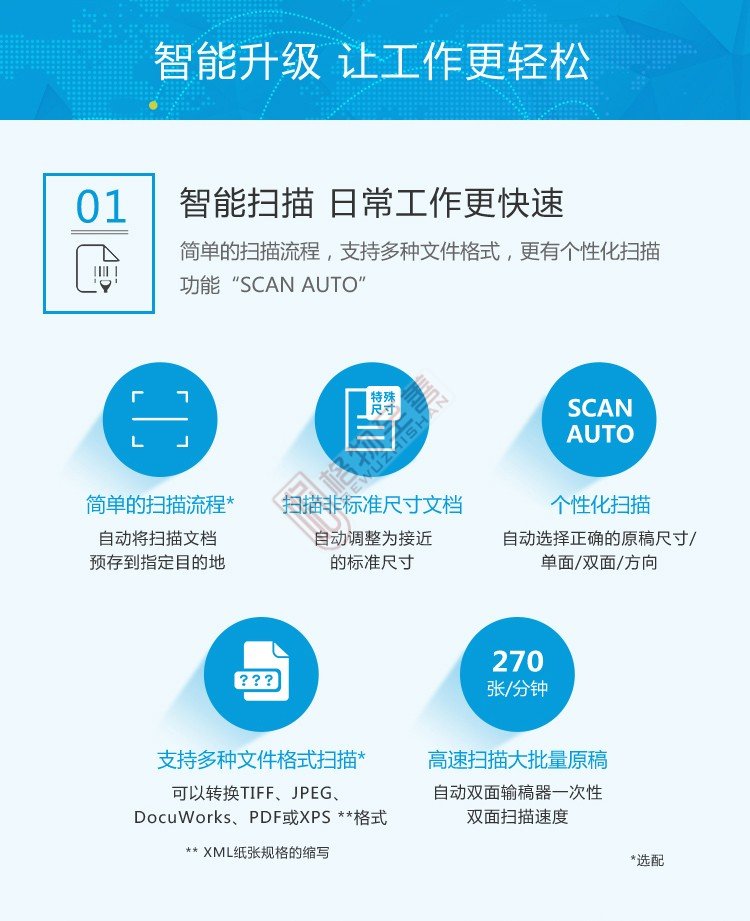 注:选配。在扫描非标准尺寸和小尺寸的纸质文档时,只需使用自动双面输稿器来扫描,设备便可以自动将尺寸调整到最接近的标准尺寸。轻松扫描收据和订货单,而无需分别输入每个文档尺寸。支持多种文件格式和处理。电子邮件数据或扫描数据可以转换成TIFF、JPEG、DocuWorks、PDF或XPS*1格式。设备还提供OCR处理*2,以便于进行快速搜索。设备还可以对数据进行压缩来减少网络负载,并支持设置密码。